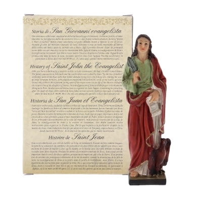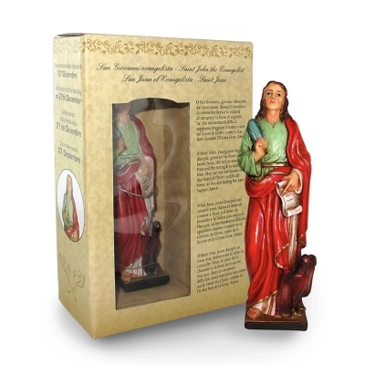 Carinissima statua in resina, dall'altezza di 12 cm, di San Giovanni Evangelista, rappresentato con la sua simbologia tipica. Confezionata in una scatola su cui è scritta una preghiera e la storia del Santo. La ricorrenza di questa festività avviene il 27 dicembre. San Giovanni Evangelista è patrono di artisti, cartolai, fabbricanti, librai e tipografi.