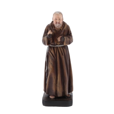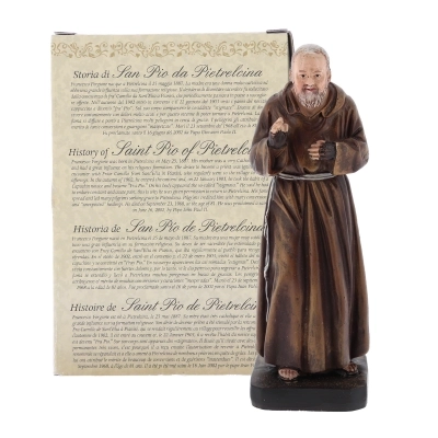 Carinissima statua in resina, dall'altezza di 12 cm, di San Pio, rappresentato con la sua simbologia tipica. Confezionata in una scatola su cui è scritta una preghiera e la storia del Santo. La ricorrenza di questa festività avviene il 23 settembre. San Pio è considerato un intercessore potente e un esempio di santità e sacrificio per i credenti. Dotato di doni straordinari che hanno richiamato su di lui l'attenzione del mondo intero.