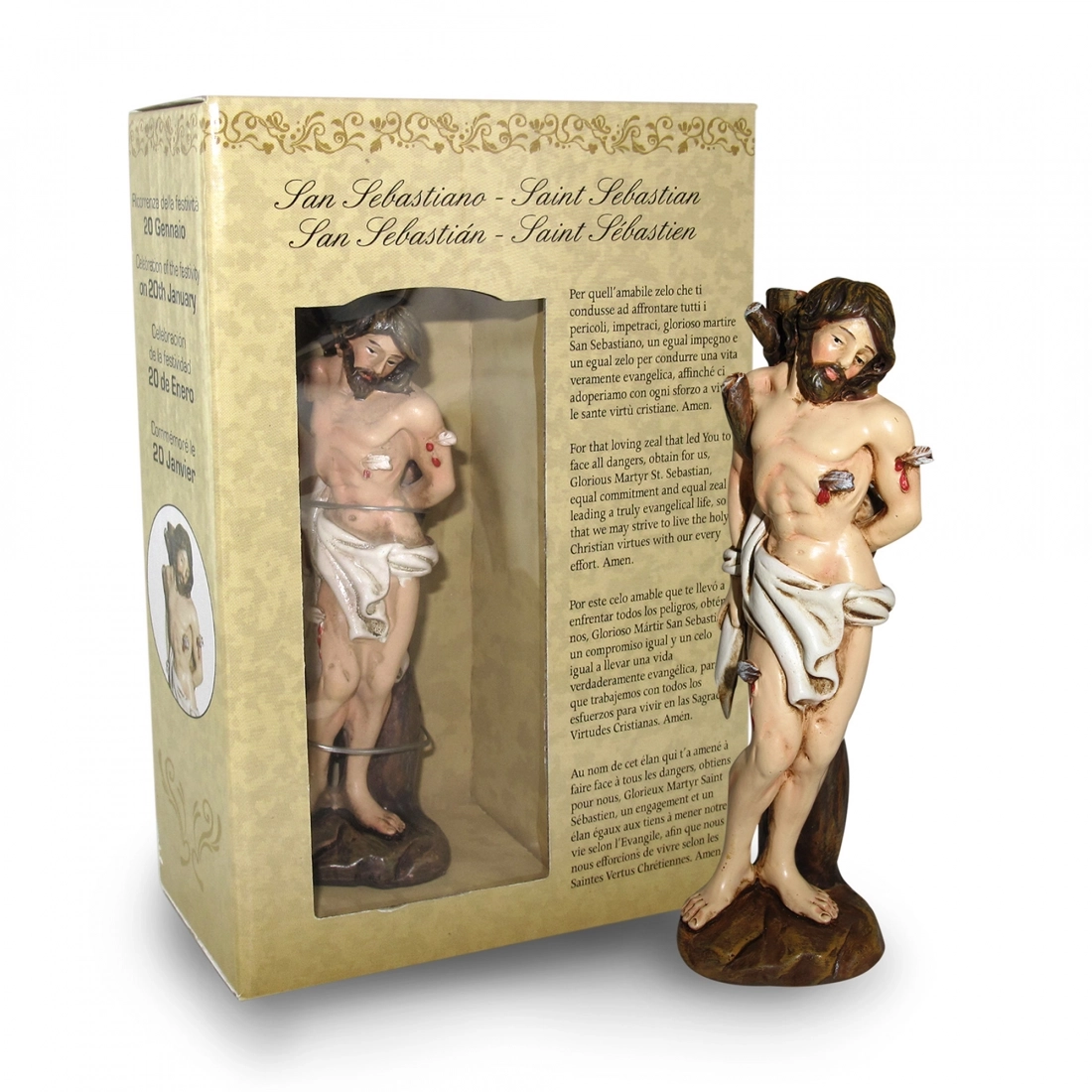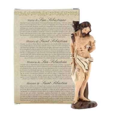 Carinissima statua in resina, dall'altezza di 12 cm, di San Sebastiano, rappresentato con la sua simbologia tipica. Confezionata in una scatola su cui è scritta una preghiera e la storia del Santo. La ricorrenza di questa festività avviene il 20 gennaio. San Sebastiano è patrono di polizia locale in Italia, arcieri, tappezzieri, sofferenti, militari.