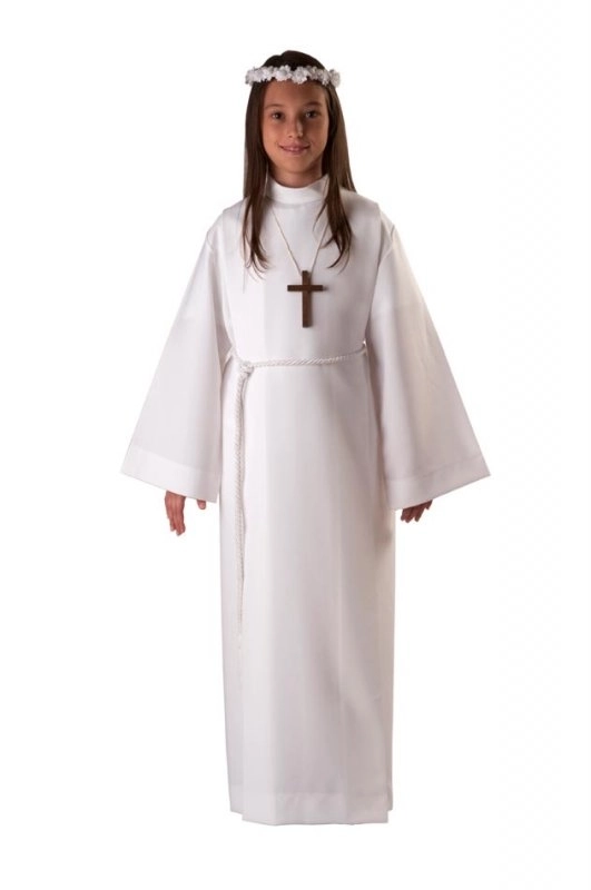 Veste per Prima Comunione, adatta per maschi e femmine, realizzata in 100% poliestere, di colore bianco a tinta unita senza alcun decoro. Presenta due piegoni sia nella parte frontale che posteriore, ha il collo rivoltato e la manica larga. L'abito è disponibile in varie misure standard con la possibilità di avere delle misure personalizzate, consultare la tabella e lo schema presente tra le foto del prodotto. Realizzata e confezionata interamente in Italia. Su richiesta è disponibile avere anche la colorazione avorio.