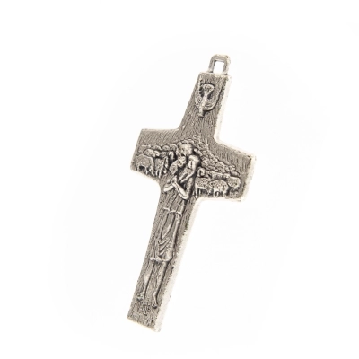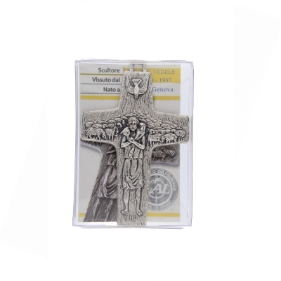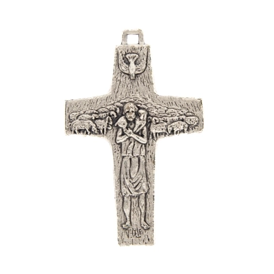 Croce dotata di occhiello, da appendere al collo, delle dimensioni di 4,8x3,5 cm e realizzata in metallo. L'immagine rappresenta "Il Buon Pastore" che conduce il gregge all'ovile e porta la pecora smarrita sulle spalle. Disegnata dallo scultore genovese Antonio Vedele, è la stessa che è stata portata da Papa Francesco, il quale ha rinunciato alla croce d'oro, per indossare quella da "povero".