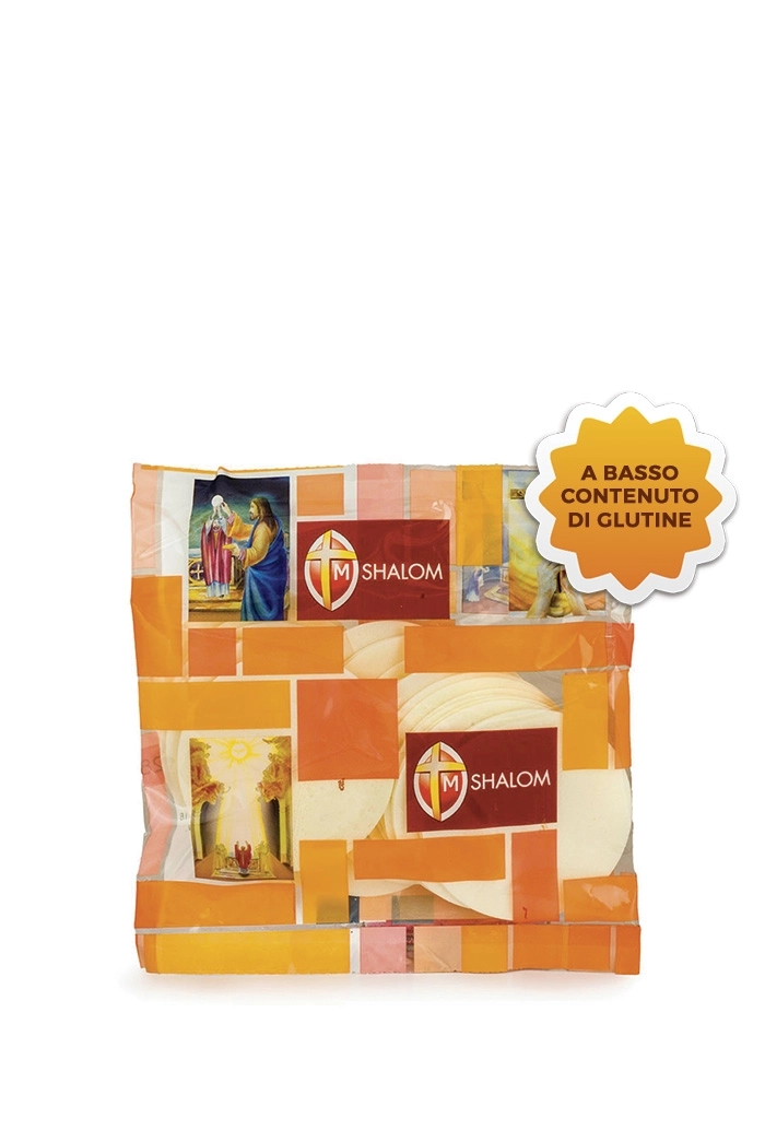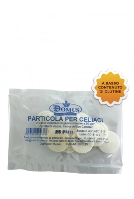 Ostia particola per la celebrazione della messa, a basso contenuto di glutine, adatte per i celiaci. Sono particole prodotte con farina del tipo cerestar, con garanzia di genuinità e lunga conservazione. Queste particole sono prodotte con grande cura nel rispetto assoluto delle regole canoniche di preparazione. Contengono glutine al di sotto di 20 ppm. INGREDIENTI: Acqua, amido di frumento.