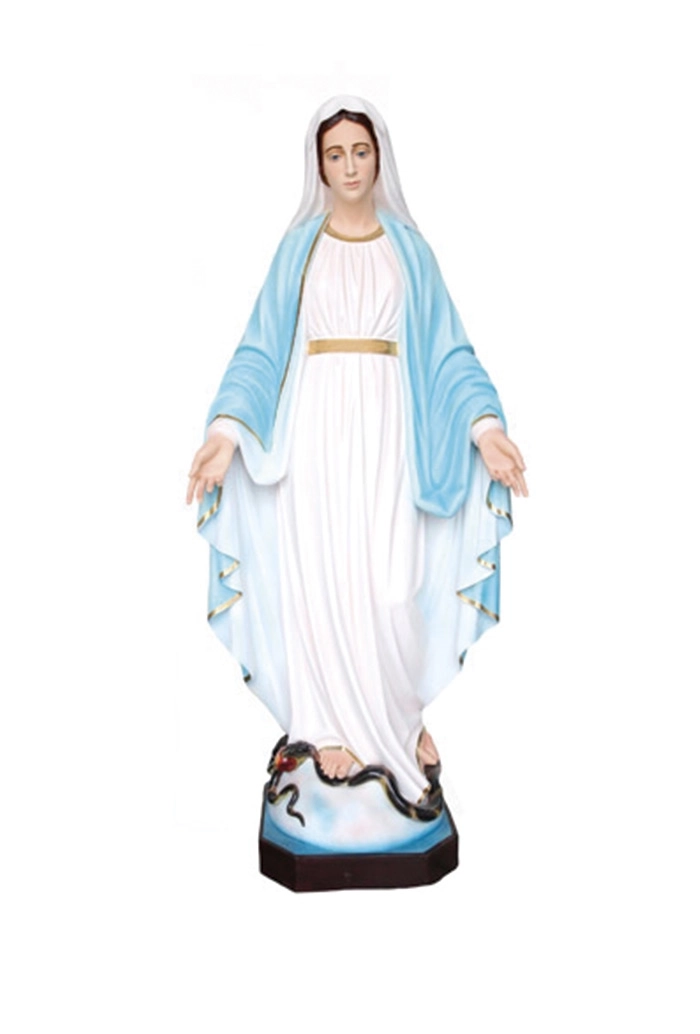 Statua della Madonna Immacolata in vetroresina, prodotta interamente in Italia, finemente lavorata e dipinta a mano, con vernici ad olio, da artigiani altamente specializzati. Viso, veste, capelli sono curati in ogni minimo dettaglio, gli occhi in vetro rendono lo sguardo più vivo ed il volto più espressivo, rappresentando al meglio la fisionomia della Madonna. Questa statua, non essendo molto pesante, si adatta bene al trasporto durante le processioni, le caratteristiche di leggerezza e rigidità consentono infatti una facile e sicura movimentazione. La composizione in vetroresina la rende resistente all'azione degli agenti atmosferici, non teme l'umidità ed il gelo. E' indicata per l'esposizione in grotte, nicchie, balconi, davanzali e arredo giardino.