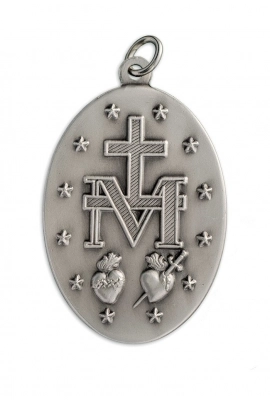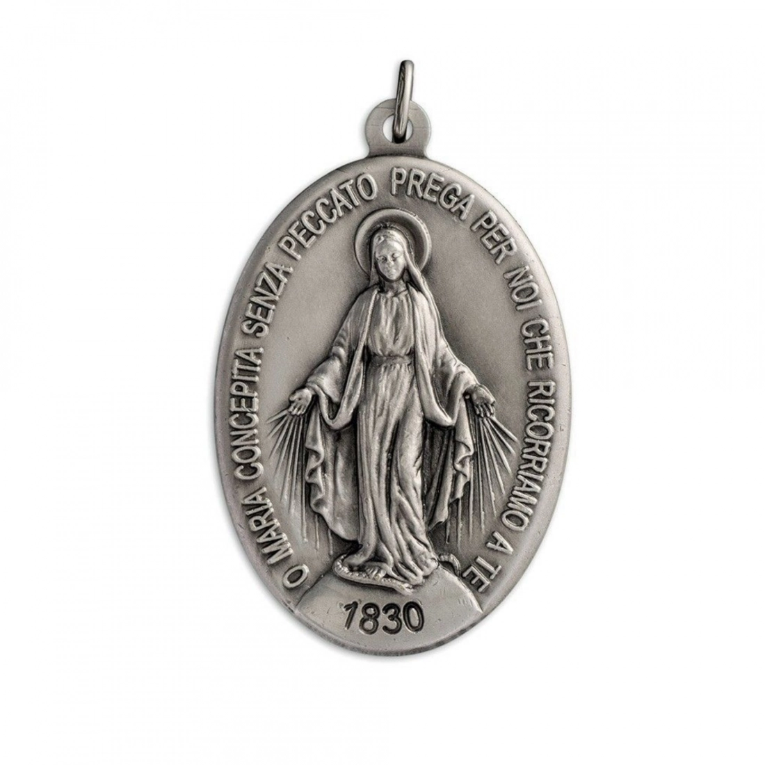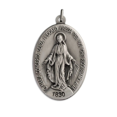 Bellissima medaglia Miracolosa in argento 925, dal peso di 10 gr. e altezza di 2,7 cm, riprodotta fedelmente come l'originale, così come apparsa alla veggente Santa Caterina de Labourè nel 1830 a Rue de Bac. La scritta nella parte frontale è in lingua italiana e riporta la seguente frase "O Maria concepita senza peccato prega per noi che ricorriamo a te". La medaglia è dotata di anellino per poter essere appesa ad una catenina ed indossata al collo (catenina non inclusa). La medaglia è estremamente dettagliata e rifinita con cura. Realizzata appositamente per Editrice Shalom, che ne ha seguito direttamente tutta la lavorazione, dalla scultura in plastilina fino alla realizzazione del primo modello. Rigorosamente ideata e prodotto in Italia da un'azienda artigianale e leader nella produzione di medaglie.