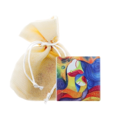 Bellissimo magnete d'Autore, con una raffigurazione delicata e raffinata di un amorevole abbraccio tra una mamma e il suo bambino. Carinissima idea regalo da donare in qualsiasi occasione. Adatta anche a bomboniera per una Nascita o battesimo.