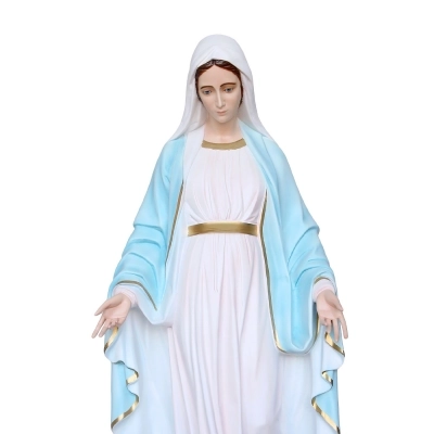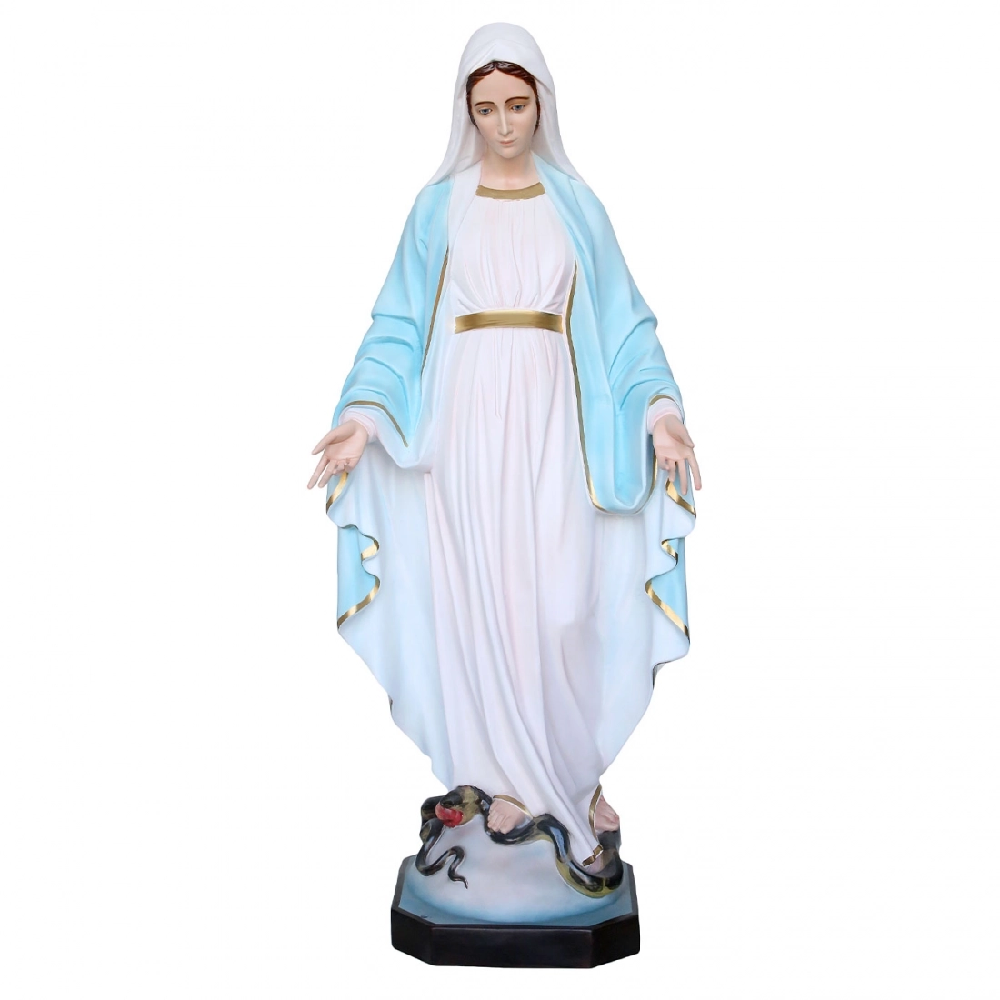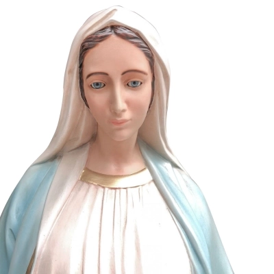 Statua della Madonna Immacolata in vetroresina, prodotta interamente in Italia, finemente lavorata e dipinta a mano, con vernici ad olio, da artigiani altamente specializzati. Viso, vesti, capelli sono curati in ogni minimo dettaglio, gli occhi in vetro rendono lo sguardo più vivo ed il volto più espressivo, rappresentando al meglio la fisionomia della Madonna.