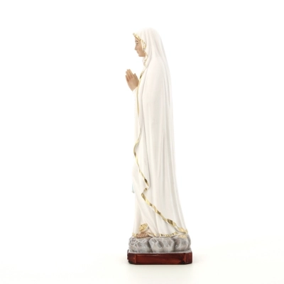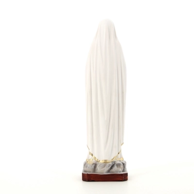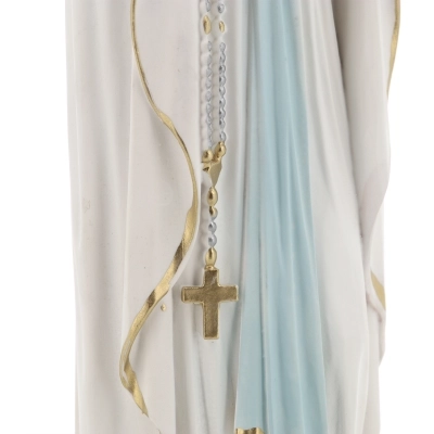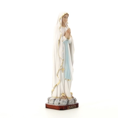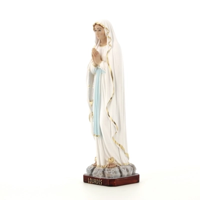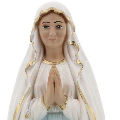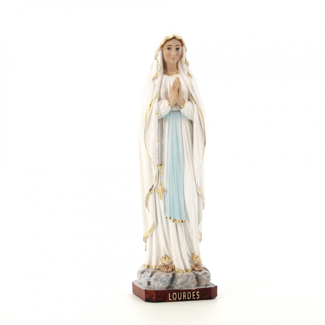 Bellissima statua, dall'altezza di 31 cm, realizzata in resina, raffigurante la Madonna di Lourdes, con le mani giunte in preghiera, una corona del Rosario appesa al braccio e due rose gialle ai piedi; così come è apparsa alla giovane Bernadette. Scrupolosamente realizzata e curata in ogni minimo dettaglio. Ideata e prodotta interamente in Italia, da un'azienda di artigiani esperti nella realizzazione di statue in resina e vetroresina.