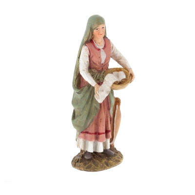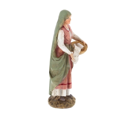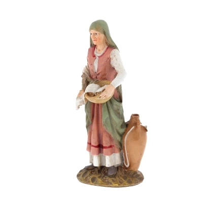 Statuina raffigurante la contadina levatrice con cesta in mano e anfora appoggiata sulla base, ideale per la personalizzazione del proprio presepe, si adatta a presepi con statuine alte circa 10 cm. La statuina è realizzata in resina dipinta a mano. Il modello è stato realizzato dal famoso scultore Martino Landi.