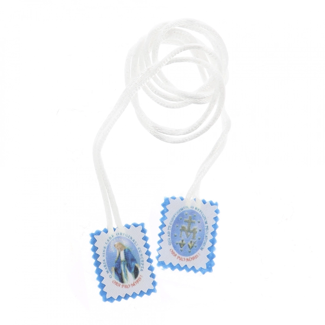 Scapolare in stoffa (delle dimensioni di 3x2,5 cm) della Madonna Miracolosa. Nella confezione è presente anche un bigliettino con immagine e preghiera rivolta alla Madonna.