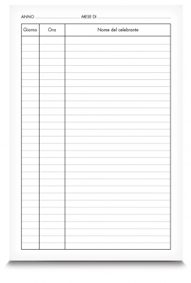 Impostato su doppia pagina, permette di segnare agevolmente: l’anno, il mese, il giorno, l’ora, il nome del celebrante, l’offerta e le intenzioni ed eventuali note.