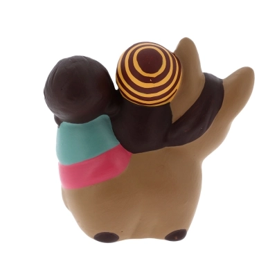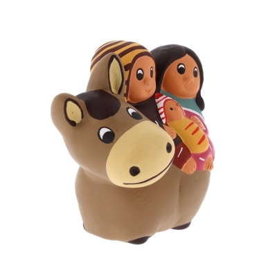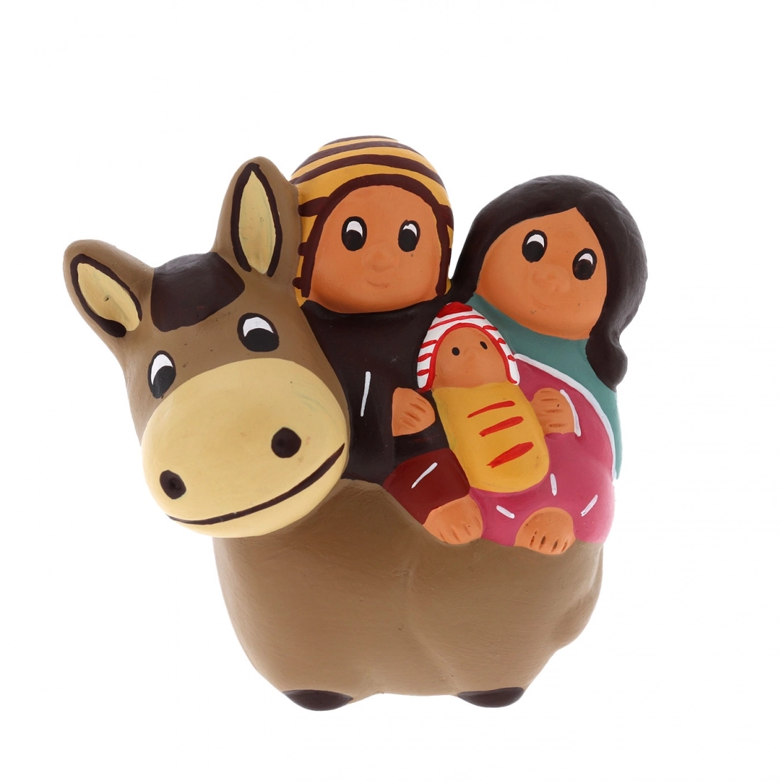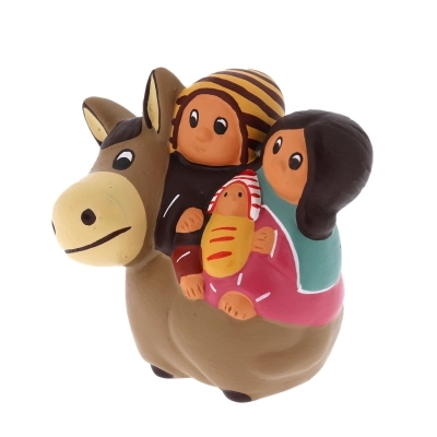 Simpatica e gioiosa rappresentazione del famoso episodio dell'infanzia di Gesù: la fuga in Egitto, in cui Giuseppe e Maria fuggono in Egitto con Gesù Bambino appena nato, dopo la visita dei Magi e dopo essere venuti a conoscenza delle intenzioni di Re Erode di uccidere tutti i bambini primogeniti. Gesù, Maria e Giuseppe sono seduti sopra un asinello. Realizzata in terracotta policroma.