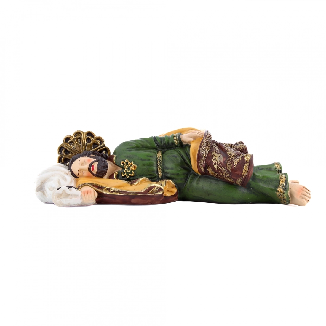 Originale statua che riproduce san Giuseppe che dorme. Papa Francesco nutre una devozione particolare per san Giuseppe dormiente e ha l'abitudine di porre sotto la statua bigliettini per affidare al grande Santo intenzioni e richieste di grazie. La statua è realizzata in resina dipinta. La lunghezza è di 40 cm.