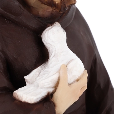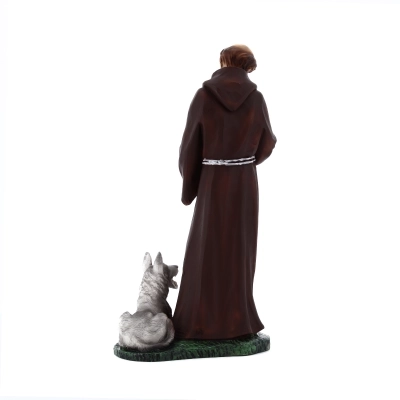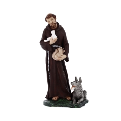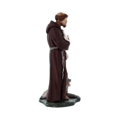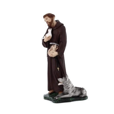 Bellissima statua, dall'altezza di 30 cm, realizzata in resina e dipinta con estrema cura dei dettagli e nelle sfumature di colore. La statua, realizzata interamente in resina colorata, rappresenta San Francesco d'Assisi, con il lupo e altri animali, questo perchè San Francesco avvertiva in loro la presenza di Dio. Realizzata in Italia da artigiani esperti nella produzione di statue in resina e vetroresina.