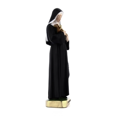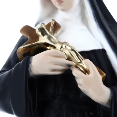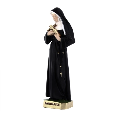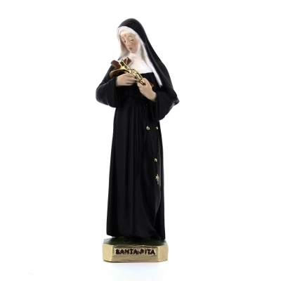Bellissima statua, dall'altezza di 30 cm, realizzata in resina e dipinta con estrema cura dei dettagli e nelle sfumature di colore. La statua, realizzata interamente in resina colorata, rappresenta Santa Rita da Cascia. Realizzata in Italia da artigiani esperti nella produzione di statue in resina e vetroresina.