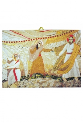 Icona in legno "Noli me tangere" di Marko Rupnik, opera significativa che rappresenta un momento cruciale del Vangelo, in cui Gesù risorto si rivolge a Maria Maddalena, dicendole di non toccarlo. Questa icona è caratterizzata da uno stile distintivo, tipico dell'arte di Rupnik, che combina elementi tradizionali con una visione contemporanea.