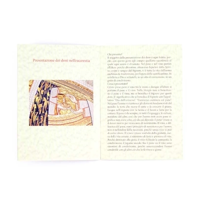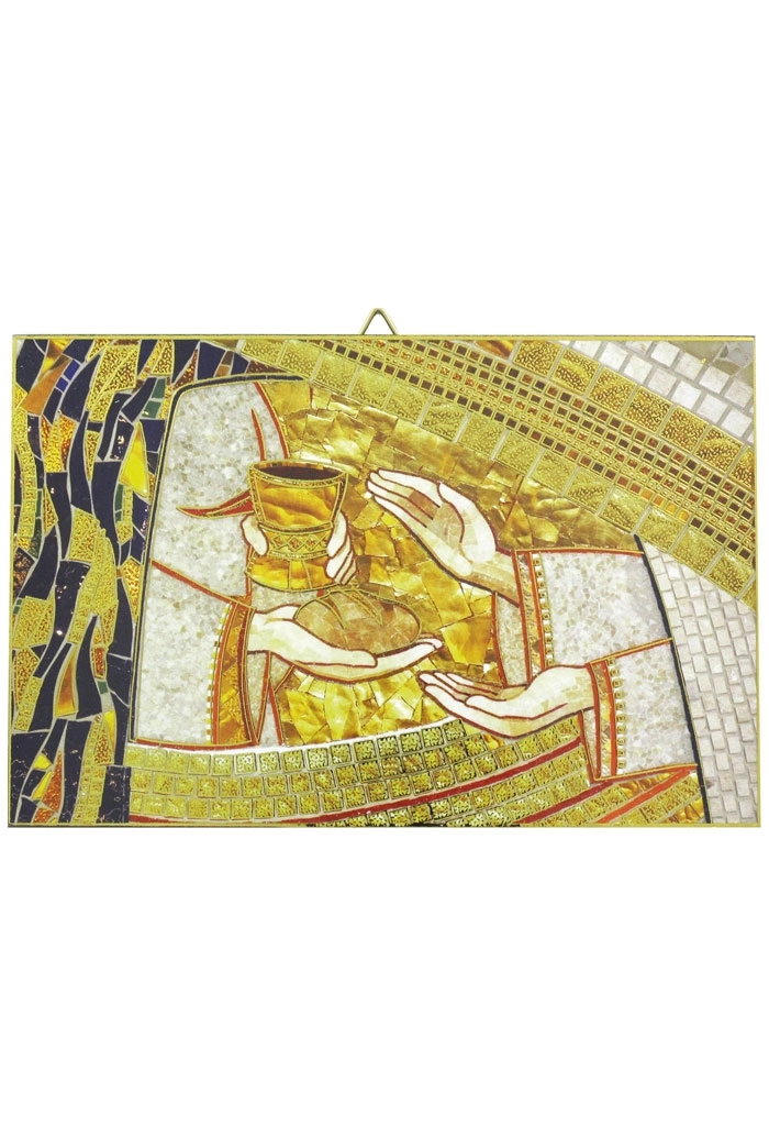 Mosaico dedicato all'Eucarestia del gesuita Marko Ivan Rupnik riprodotto su tavola in legno rettangolare con stampa oro a caldo. La tavola è munita di gancio in metallo per essere appesa e di cavalletto in plastica nera per sostenerla. Confezionata in elegante scatola in cartone finestrato contenente libretto con spiegazione.
