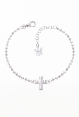 Carinissimo bracciale della lunghezza di 17 cm + 3 di allungo, con maglia formata da tante piccole sfere del diametro di 0,2 cm e al centro una croce di 1x1,5 cm. Chiusura con moschettone. Prodotto ideale da regalare in qualsiasi occasione speciale come ad esempio la festa della mamma o una Cresima. Prodotto realizzato in Italia da azienda di artigiani specializzati nella lavorazione dell'argento.