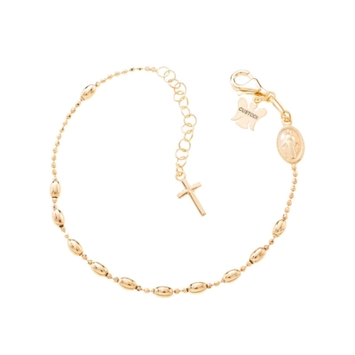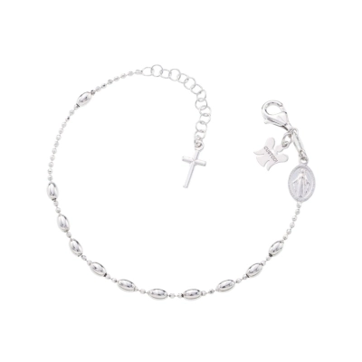 Bracciale decina in maglia pallinata, in argento 925 e chiusura con moschettone. E' costituito da 10 grani da 0,2 cm per recitare le Ave Maria e un grano per il Padre Nostro. A completare il bracciale una medaglia Miracolosa e una croce pendente che ci ricorsa come, tramite la preghiera mariana del Rosario, possiamo giungere a Gesù. Completa il braccialetto una Medaglia Miracolosa. Da portare con sè sempre e per raccogliersi in preghiera in qualsiasi momento si voglia. Disponibile nella versione argentata, dorata o rosè. Prodotto realizzato in Italia da azienda di artigiani specializzati nella lavorazione dell'argento.