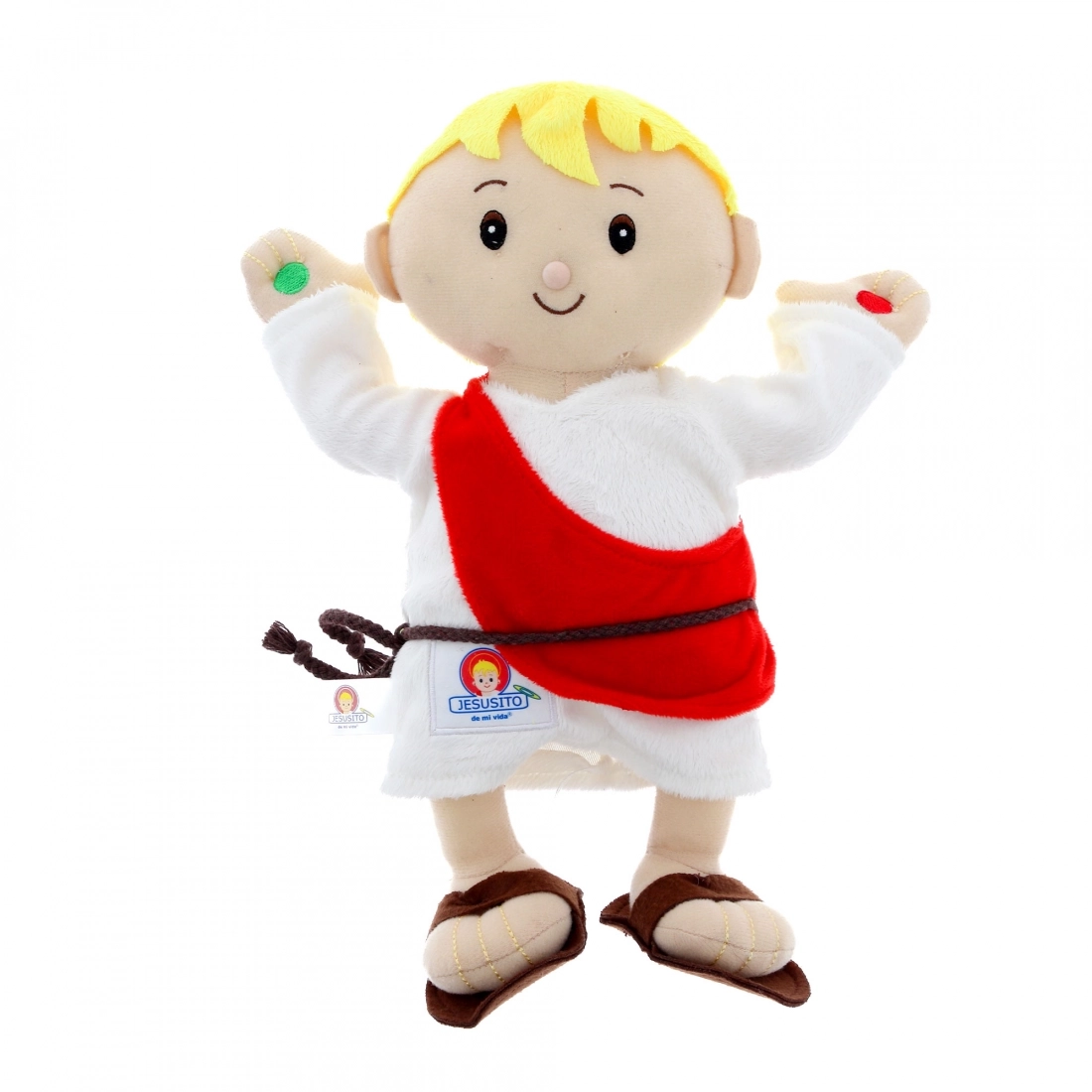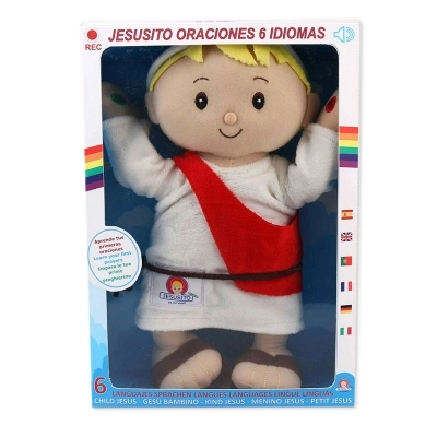 Carinissimo peluche di Gesù Bambino con altezza 30 cm. La particolarità di questo peluche è che premendo la manina si possono ascoltare diverse preghiere. Ideale da regalare ai bambini per farli avvicinare alla figura di Gesù e per far loro imparare le principali preghiere. Dispone anche della funzione registrazione per aggiungere preghiere o per recitare quello che si desidera.