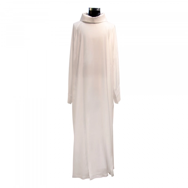 Mantellina bianca che sostituisce in modo molto pratico ed elegante il solito amitto. Modello semplice e pulito, senza ricami, con cerniera posta sulla spalla. Viene indossato solitamente sotto il camice quando quest'ultimo non è in grado di coprire il collo. Tessuto misto cotone e poliestere. Prodotto interamente realizzato in Italia da una ditta artigiana specializzata nella realizzazione di paramenti sacri.