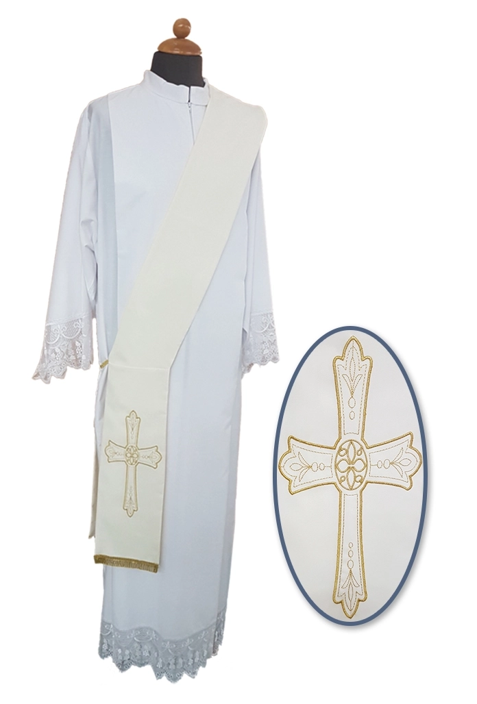 Stola per diacono confezionata in tessuto poliestere, ornata nella parte finale da un ricamo a croce, dall'altezza di 27 cm, con un fiore raffigurato all’interno. Disponibile nei colori: Avorio - Rosso - Verde – Viola. Realizzata e confezionata in Italia da un laboratorio di artigiani esperti nel settore dei paramenti sacri e abiti per il clero.
