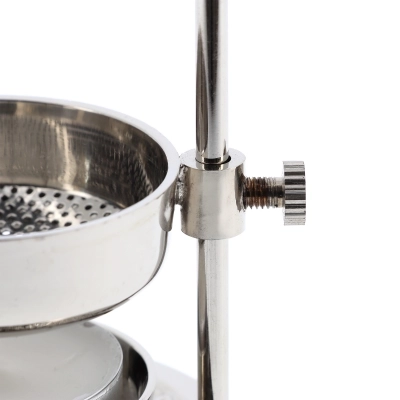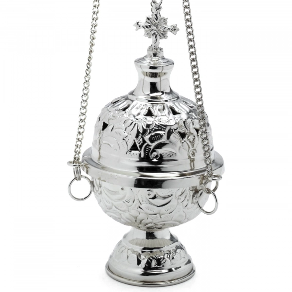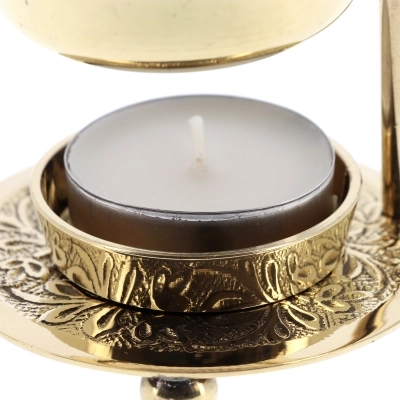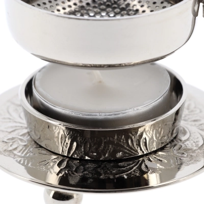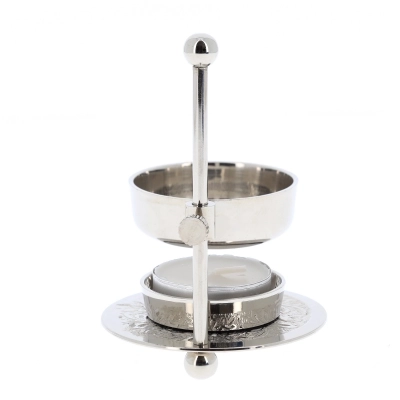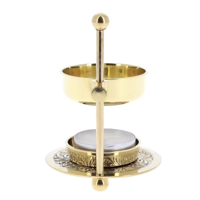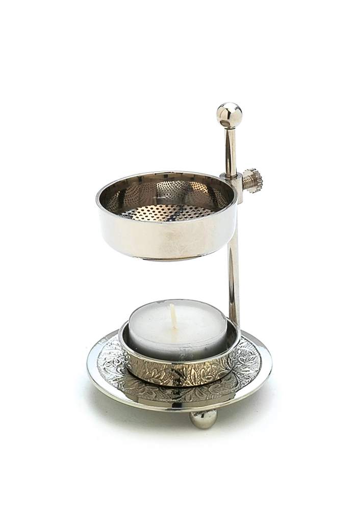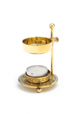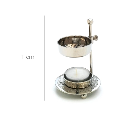 Brucia incenso dell'altezza di 11 cm e larghezza 7,5 cm, disponibile nella variante dorata o argentata. E' costituito da un supporto superiore, regolabile, in cui viene posizionato l'incenso e da uno inferiore, sapientemente cesellato, dove invece viene introdotto un lumino da accendere in modo che il calore possa far bruciare l'incenso lentamente.