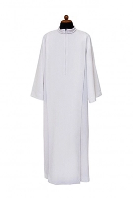 Camice sacerdotale in tessuto poliestere, monocolore, con piegoni e collo risvoltato. Caratterizzato dalla linea semplice, pulita e senza ricami. Disponibile sia nella versione bianca che avorio. Facile da indossare grazie alla zip posta sul petto. Prodotto interamente realizzato in Italia da una ditta artigiana specializzata nella realizzazione di paramenti sacri.