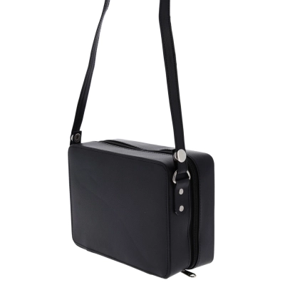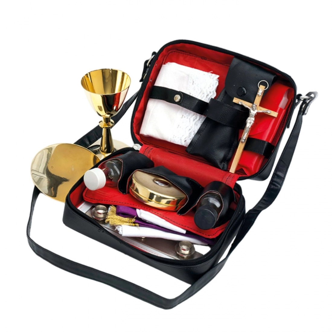 Borsa da viaggio, portaviatico, rigida, in similpelle nera, e rivestimento all'interno in tessuto rosso. La borsa è dotata di una tracolla dalla circonferenza di 90 cm. All'interno comprende: calice con patena, teca per ostie, ampolline per acqua e vino, croce da altare e candele, stola, aspersorio, set da altare in lino.
