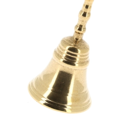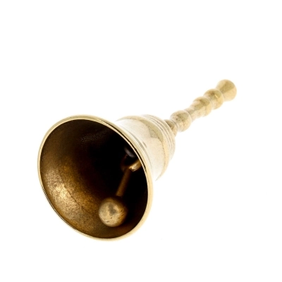 Campanella in ottone dorato lucido, dalla linea semplice e liscia. Altezza 12 cm e diametro 5,5 cm. Adatto ad un uso liturgico e domestico.