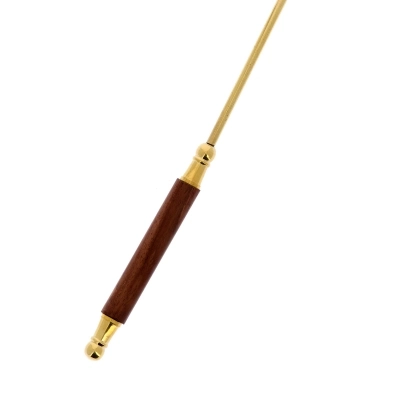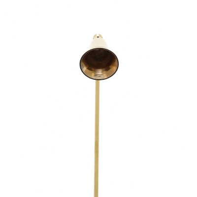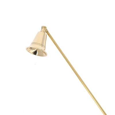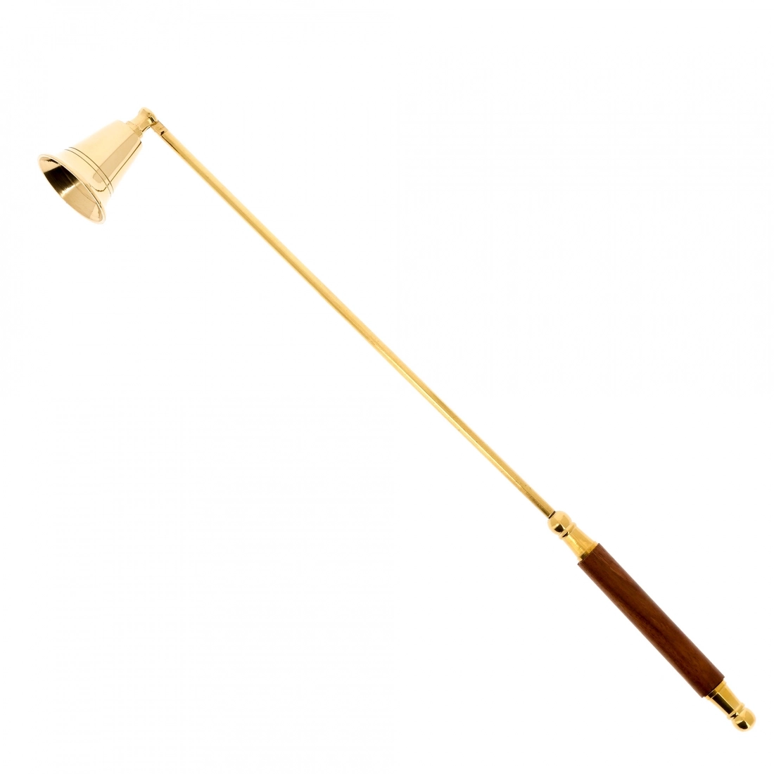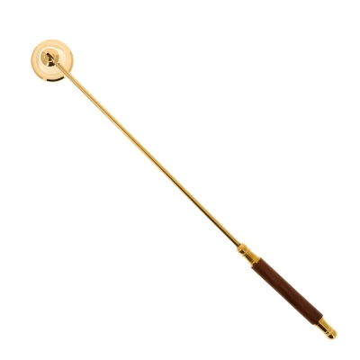 Spegni candela in ottone dorato, della lunghezza di 35 cm con manico in legno per una comoda impugnatura e campanella snodata per un uso più agevole.