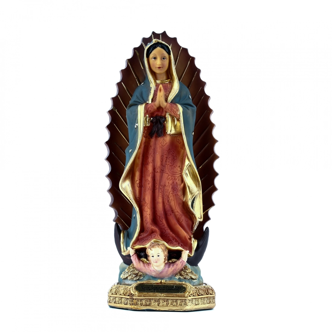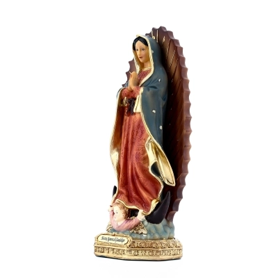 Graziosa e dettagliata statua che raffigura la Madonna di Guadalupe. La statua, dai colori brillanti, è adatta da esporre sia in qualsiasi ambiente domestico. La ricorrenza di questa festività avviene il 12 dicembre. Le apparizioni della Vergine di Guadalupe avvennero nel 1531 a nord di Città del Messico. Il nome Guadalupe venne dettato da Maria stessa a Juan Bernardino, lo zio di Juan Diego, essendogli apparsa per guarirlo da una grave malattia.