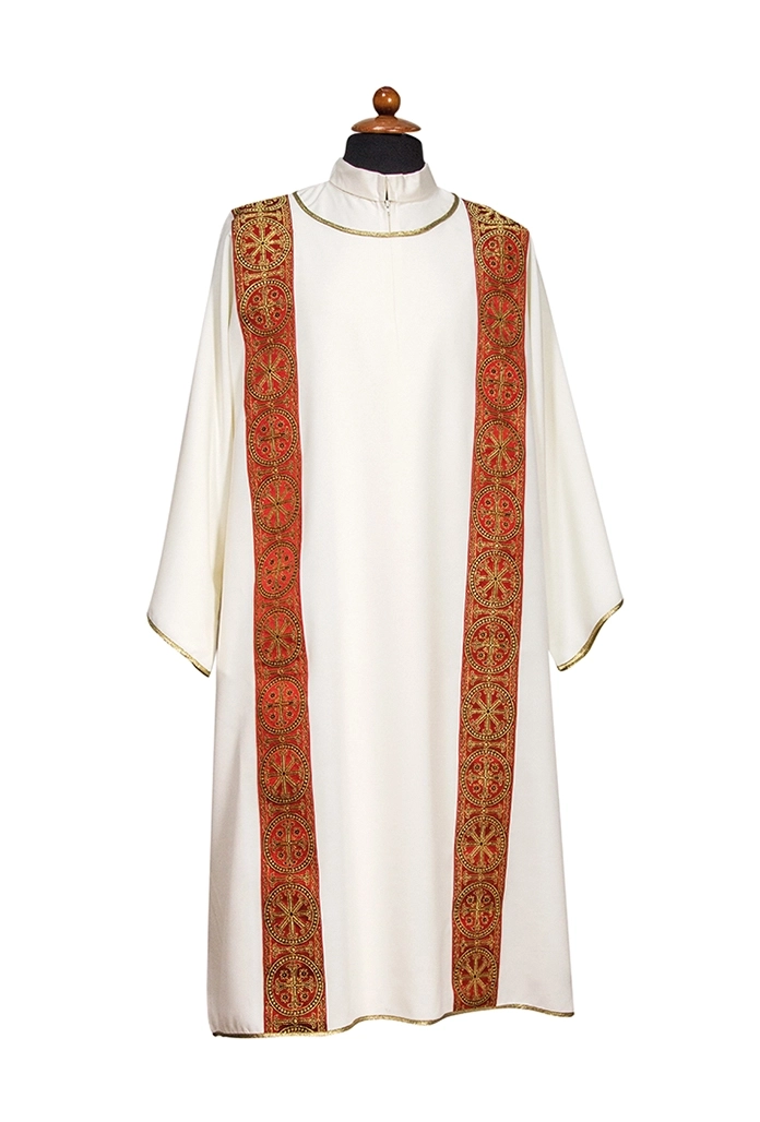 Veste per diacono in tessuto vaticano 100 % poliestere, arricchita da un pregiato gallone ricamato sul davanti. Disponibile nei colori: Avorio - Rosso - Verde – Viola. Realizzata e confezionata in Italia da un laboratorio di artigiani esperti nel settore dei paramenti sacri e abiti per il clero.