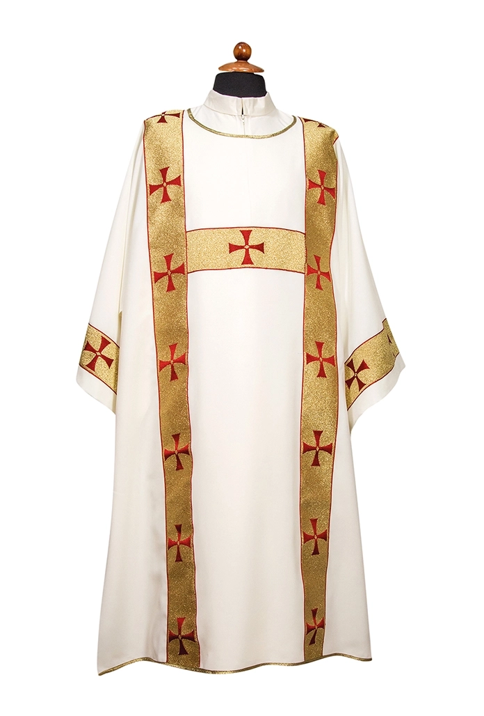 Veste per diacono impreziosita da un raffinato Gallone con croci, applicato solo sul davanti. Realizzata in tessuto Vaticano 100% poliestere. Disponibile nei colori: Avorio - Rosso - Verde – Viola. Realizzata e confezionata in Italia da un laboratorio di artigiani esperti nel settore dei paramenti sacri e abiti per il clero.