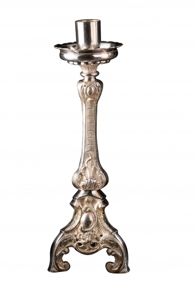 Elegante candeliere in stile barocco realizzato in ottone e placcato in argento, con decorazioni in rilievo e incisioni e dotato di tre piedi per una maggiore stabilità. Il candeliere ha un'altezza di 39 cm e presenta un piattino con punzone adatto a ceri del diametro fino a 10 cm. Il punzone è svitabile e sostituibile con un bossolo per candele con diametro fino a 4 cm.