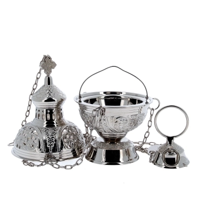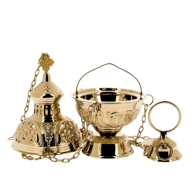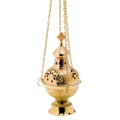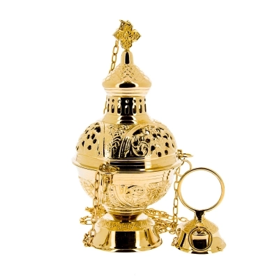 Turibolo realizzato in ottone, dell'altezza di 28 cm e larghezza 12 cm, disponibile sia nella variante dorata che in quella argentata. Viene utilizzato per bruciare l'incenso durante le celebrazioni religiose. Questo turibolo è dotato di un coperchio perforato per consentire al fumo dell'incenso di fuoriuscire.