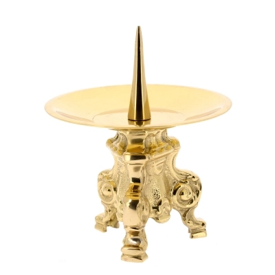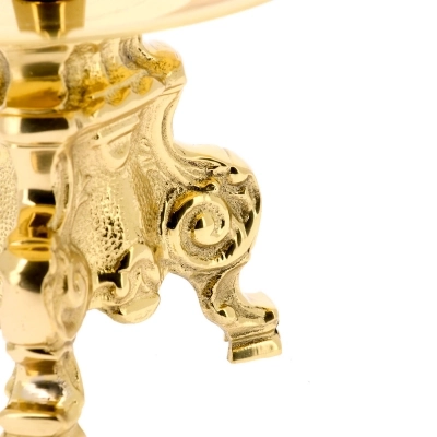 Bel portacandela realizzato in ottone dorato. La base, delle dimensioni 12x12 cm (bossolo escluso), è finemente lavorata e presenta tre piedi per una maggiore stabilità.