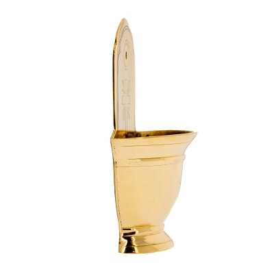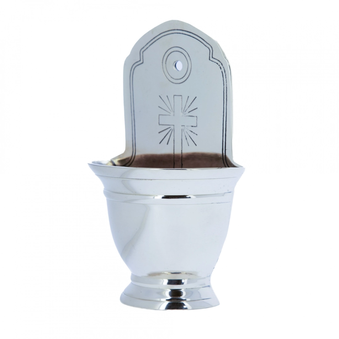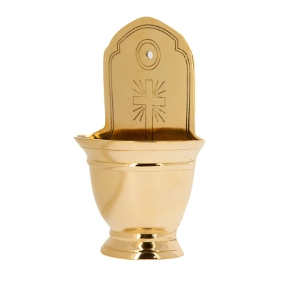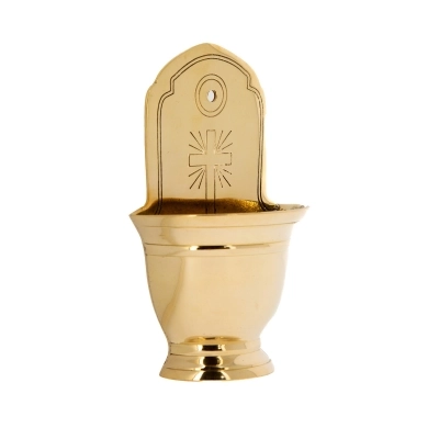 Acquasantiera realizzata in ottone, con superficie liscia e croce frontale. Il prodotto, che presenta un forellino per essere appeso, è realizzato in ottone ed è disponibile nella versione dorata e argentata. Dimensioni 8x13 cm