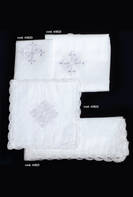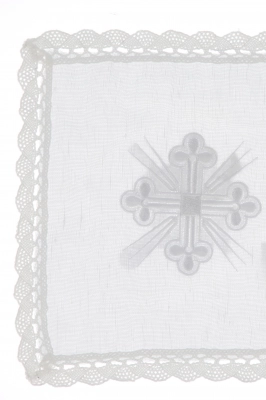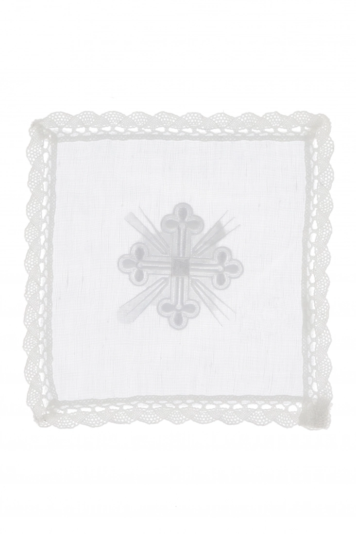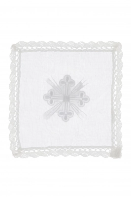 Palla in lino e poliestere, con croce ricamata e merletto laterale, delle dimensioni di 16x16 cm. Viene usata per coprire il calice, sopra il quale viene posato anche il corporale ripiegato, e la patena.