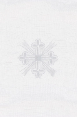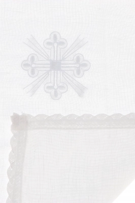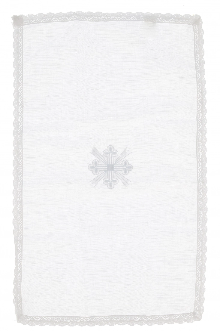 Purificatoio di colore bianco in lino e poliestere, delle dimensioni 28x48 cm. Il purificatoio è un rettangolo di stoffa che viene utilizzato dal sacerdote durante la celebrazione liturgica per pulire la patena prima di appoggiarvi l'ostia, per pulire il calice prima di riempirlo e per asciugarlo alla fine della comunione e per asciugarsi le labbra dopo aver bevuto.