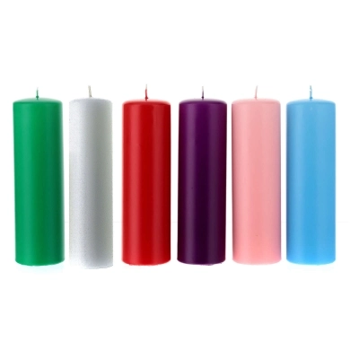 Ceri delle dimensioni di 6x20 cm, di vari colori, adatti a ogni ricorrenza e tempo liturgico. Ideali per altari e chiese ma anche per abitazioni. Il colore è opaco e brillante e le candele, prodotte da un'azienda italiana, sono di ottima qualità. Durata di circa 71 ore.