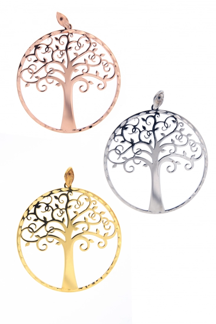 Elegante ciondolo di dimensione 4,5 in argento 925 rodiato, che ha come soggetto l’albero della vita, simbolo di vita, di nascita e di rinascita; simbolo della vita terrena che tende al cielo e, quindi, anche di risurrezione.Dotato di occhiello per essere appeso ad una catenina ed essere indossato comodamente. Disponibile nella variante argentata, dorata e rosè. Prodotto realizzato in Italia da azienda di artigiani specializzati nella lavorazione dell'argento.