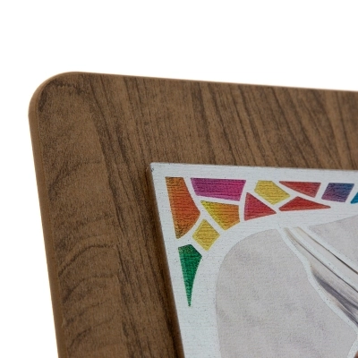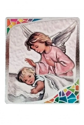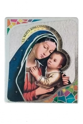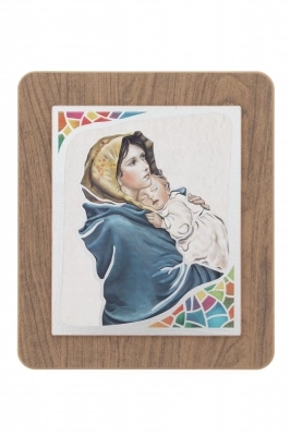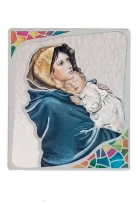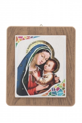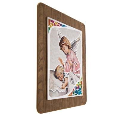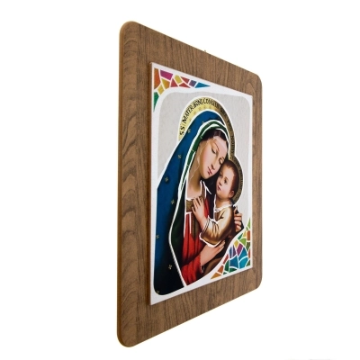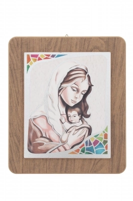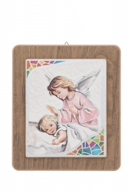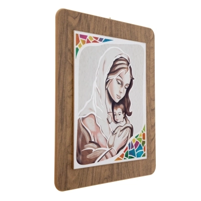 Quadro in legno con appoggio e immagine stampata su foglia argento con dettagli colorati. Sono disponibili quattro varianti: un Angelo Custode e tre immagini diverse della Madonna con Bambino. Bella idea regalo per qualsiasi occasione. Complemento d'arredo che ben si presta ad essere inserito in ogni ambiente della casa e che si adatta sia ad un arredo classico che ad uno più moderno.