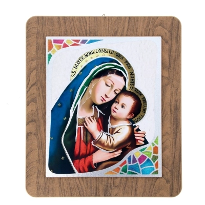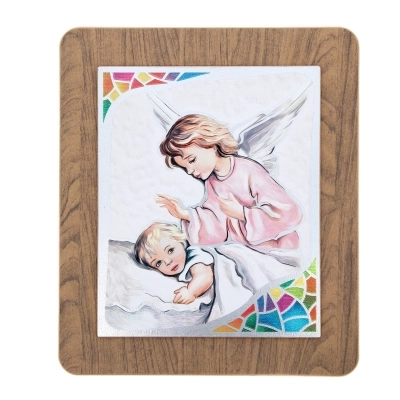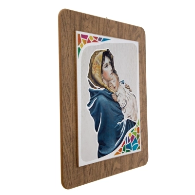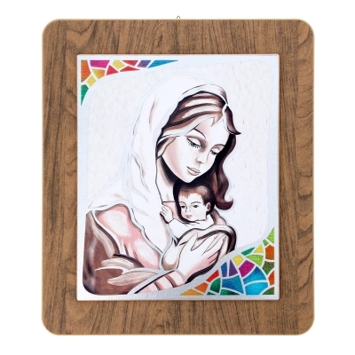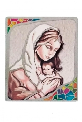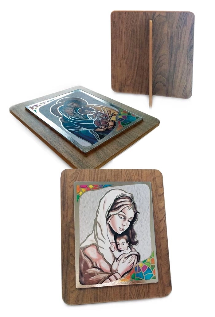 Quadro in legno con immagine stampata su foglia argento con dettagli colorati. Sono disponibili quattro varianti: un Angelo Custode e tre immagini diverse della Madonna con Bambino. Bella idea regalo per qualsiasi occasione. Complemento d'arredo che ben si presta ad essere inserito in ogni ambiente della casa e che si adatta sia ad un arredo classico che ad uno più moderno. Dimensioni 39x45 cm