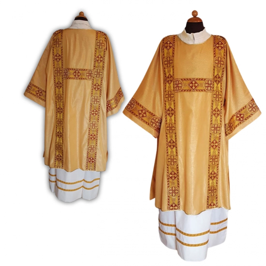 Veste per diacono in tessuto papale dorato, arricchita da un pregiato gallone ricamato presente sul davanti e sul retro. Disponibile solo nella versione color oro, da utilizzare nelle occasioni speciali: il colore oro viene utilizzato per le occasioni in cui è necessaria la massima regalità, per delle occasioni solenni e per le grandi feste. Realizzata e confezionata in Italia da un laboratorio di artigiani esperti nel settore dei paramenti sacri e abiti per il clero.