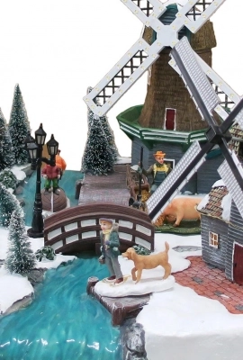 Un tipico paesaggio olandese natalizio realizzato in resina con luci, musica e animazioni. La scena si sviluppa in prossimità di due mulini al vento e un fiume, con i personaggi intenti a svolgere le proprie mansioni quotidiane insieme ai loro animali. Una volta acceso con un interruttore posteriore a scorrimento, che consente di animare la scena in modo completo (movimenti, luci e suoni) o di silenziare i suoni lasciando solo i movimenti e le luci, le pale dei mulini iniziano a muoversi e il fattore si anima, trasportando un contenitore. L’alternarsi di luci calde e fredde, la coltre di neve che ricopre tutto e i numerosi particolari rendono l’insieme ancora più realistico e affascinante. Alimentato a corrente elettrica mediante un trasformatore da 220-240V (per presa europea, incluso nella confezione). Confezione: 66 cm (L), 44 cm (A), 56 cm (P).