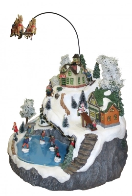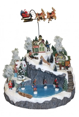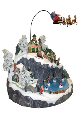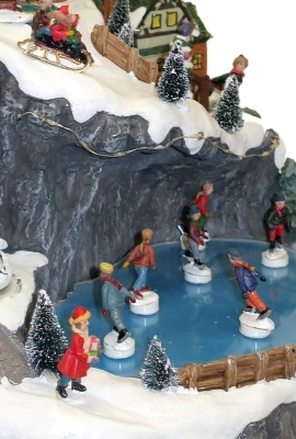 Questa scena natalizia animata in resina raffigura un suggestivo villaggio su più livelli, arroccato su un’altura rocciosa innevata. Ha come protagonista una pista di pattinaggio con pattinatori. Nei vari livelli trovano posto tre case colorate e nel cielo, a mezz'aria, si staglia la slitta di Babbo Natale trainata da 4 renne. Quando acceso, il villaggio prende vita: il sottofondo musicale scandisce melodie natalizie e le luci bianche si accendono di una luce fredda. La scena viene animata dai pattinatori sulla pista che cominciano a inseguirsi e dalla slitta che volteggia gioiosamente nel cielo. Anche un albero di Natale illuminato e la piccola altalena per bambini si muovono contribuendo a donare dinamicità e gioia alla scena. La fedeltà di resa dei dettagli rende questo villaggio in miniatura ancora più affascinante e realistico. Alimentato a corrente elettrica mediante un trasformatore da 220-240V (per presa europea, incluso nella confezione), può essere spento col comodo interruttore posteriore a scorrimento, che consente di animare la scena in modo completo (luci, movimenti e suoni), oppure di silenziarla, facendo in modo che solo luci e movimenti compiano la loro magia. Peso: 3,5 kg (4,736 kg con imballo). Dimensioni: 39 cm (L), 42 cm (A), 36 cm (P). Imballo: 47,5 cm (L), 41 cm (A), 47,5 cm (P).