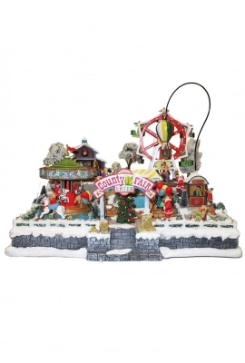 Una fiera di campagna in perfetta atmosfera natalizia! Molteplici gli elementi che rendono l’insieme così d’effetto e magico: una ruota panoramica a forma di stella di fianco a un maneggio con cavalli, una giostra stile carosello, una bancarella e una mongolfiera. Accendendo la scena con l’apposito interruttore posteriore a scorrimento e selezionando la modalità con o senza melodie natalizie, i vari elementi prendono vita: luci fredde sulla staccionata e sulla giostra illuminano il parco; la ruota panoramica, illuminata da LED dalla luce calda, inizia a girare facendo ondeggiare le graziose cabine, insieme alla giostra e alla mongolfiera. Questa riproduzione in resina è popolata da vari personaggi vestiti da Babbo Natale che, insieme ai coloratissimi giocolieri, rendono l’atmosfera ancora più allegra; inoltre, la cura e la minuzia dei dettagli rendono l’oggetto di enorme pregio. Alimentato a corrente elettrica mediante un trasformatore da 220-240V (per presa europea, incluso nella confezione). Peso: 5,250 kg (6,363 kg con imballo). Dimensioni: 44 cm (L), 36 cm (A), 40 cm (P). Imballo: 50 cm (L), 38 cm (A), 46 cm (P).