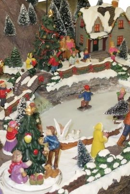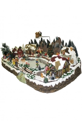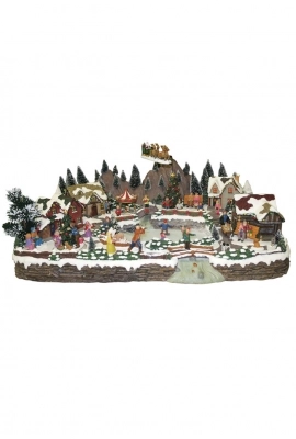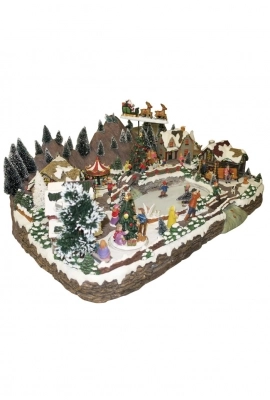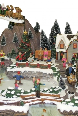 Un tipico villaggio natalizio in resina in cui spicca il laghetto ghiacciato che diventa una pista di pattinaggio. Le case, i personaggi impegnati in occupazioni tipiche delle feste, come decorare l’albero o portare doni, gli animaletti, le case e la slitta di Babbo Natale danno vivacità e colore alla rappresentazione. Accendendo il villaggio con l’apposito interruttore posteriore a scorrimento e selezionando la modalità con o senza melodie natalizie, tutto prende vita: le luci sulla base e sulle case si accendono, un albero di Natale, insieme a due giovani intenti a decorarlo, si anima, le statuine dei pattinatori sul lago danno il via al loro aggraziato volteggiare. La slitta di Babbo Natale con le renne comincia il suo viaggio girando dolcemente sopra il paese. Anche la piccola giostra carosello, ruotando, dona magia al paesino. L'attenzione alla resa dei dettagli (come la pavimentazione dei vialetti o gli addobbi che adornano edifici e ponti) rendono questa scena realistica e affascinante. Alimentato a corrente elettrica mediante un trasformatore da 220-240V (per presa europea, incluso nella confezione). Imballo: 71 cm (L), 40,5 cm (A), 54 cm (P)