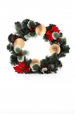 Questa corona con fiori Stella di Natale è munita di 4 piattini del diametro di circa 5 cm, utili per appoggiare le candele. Nei piattini è presente anche un punzone dove si può inserire la candela per evitare che cada.
