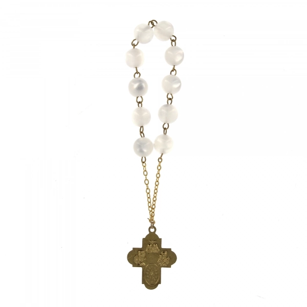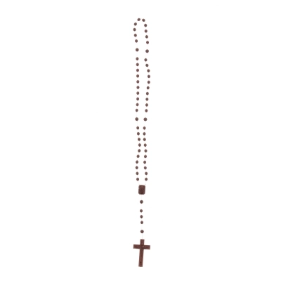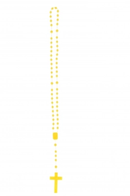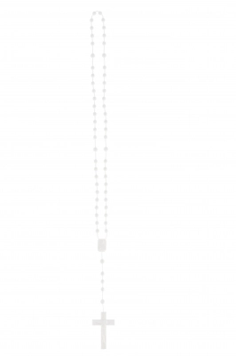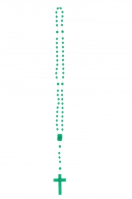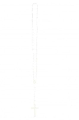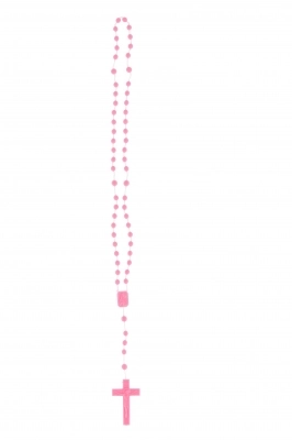 Corona del Rosario con grano tondo in plastica e cordicella in nylon imbustato singolarmente. Disponibile in vari colori. Sulla crociera è visibile un'immagine in rilievo della Vergine Maria.